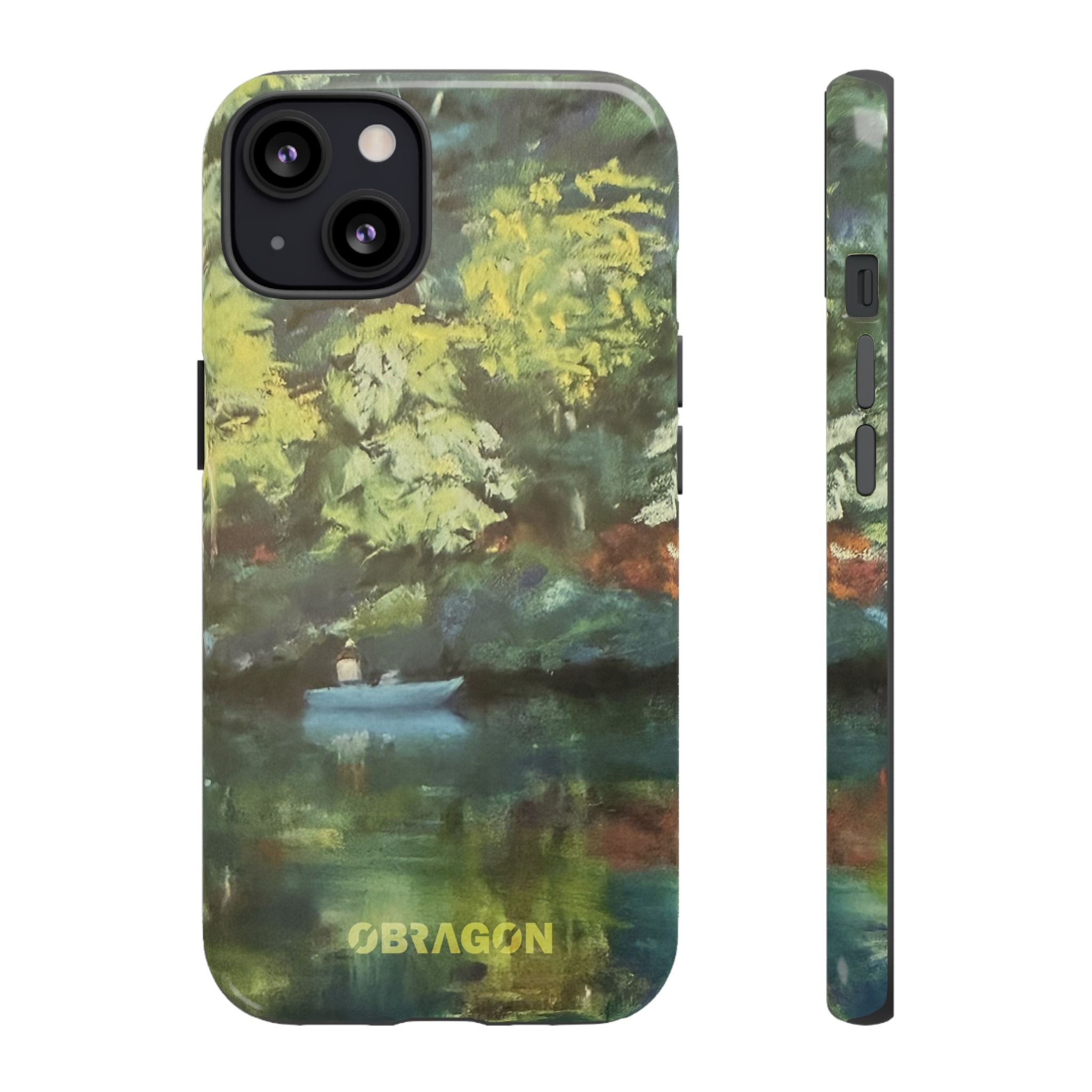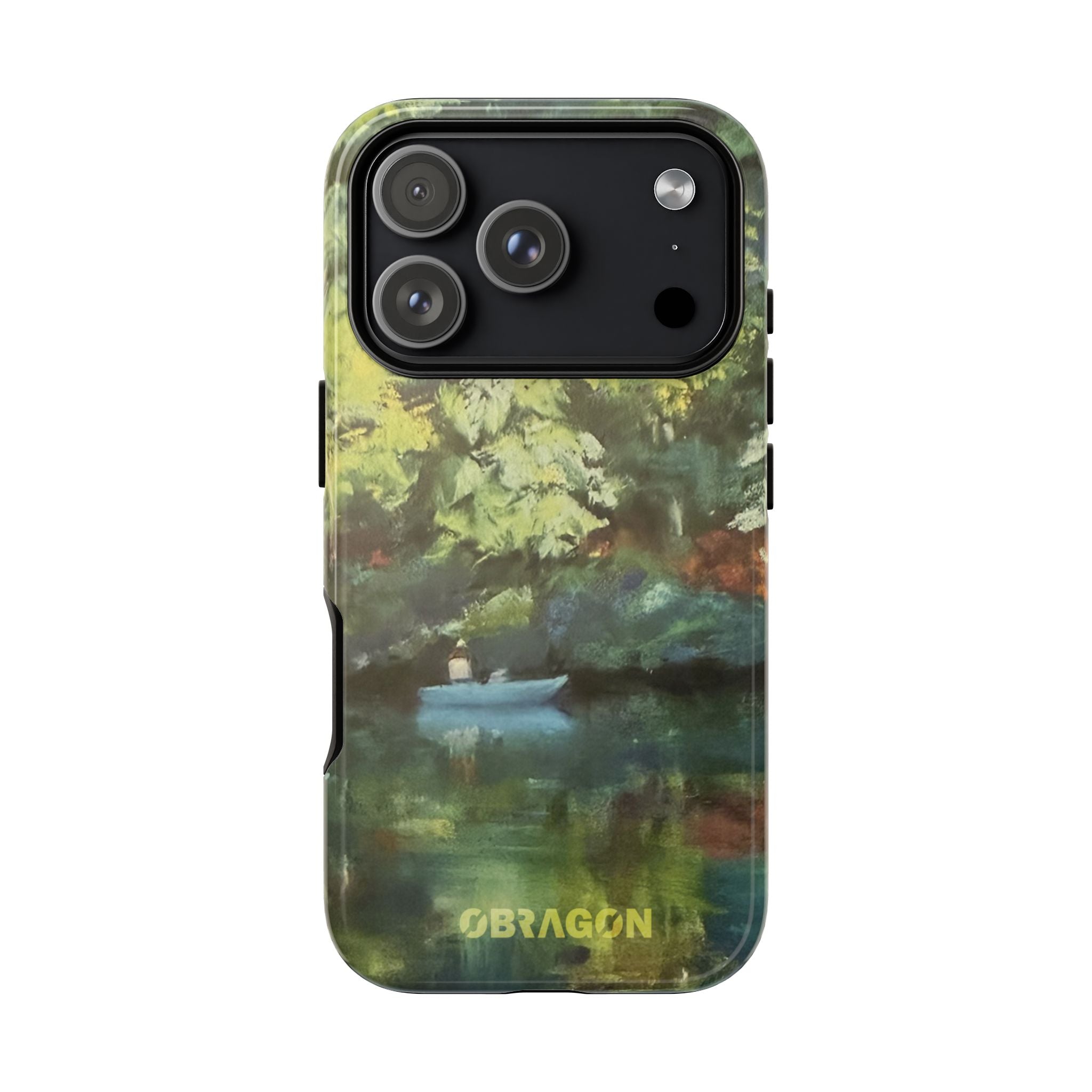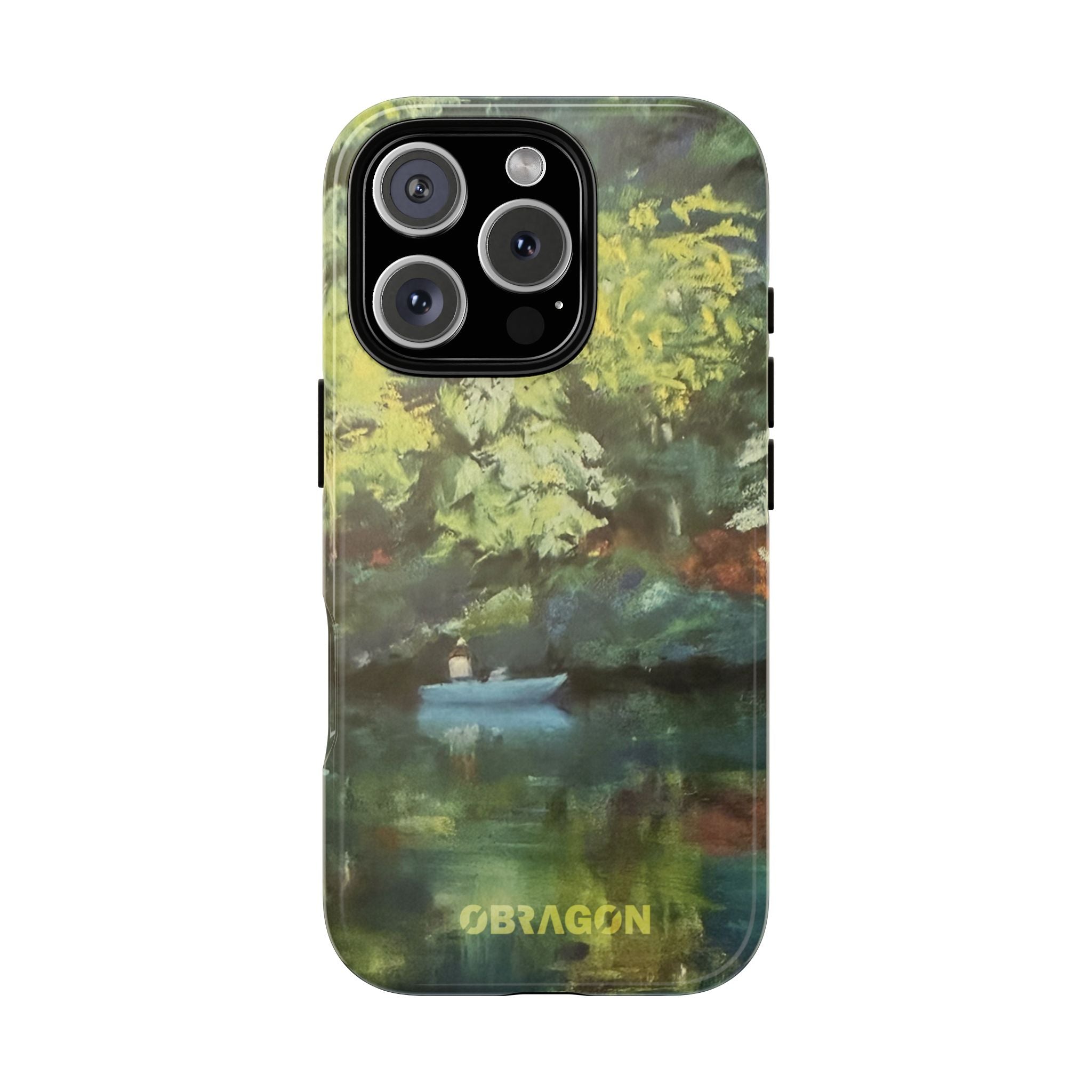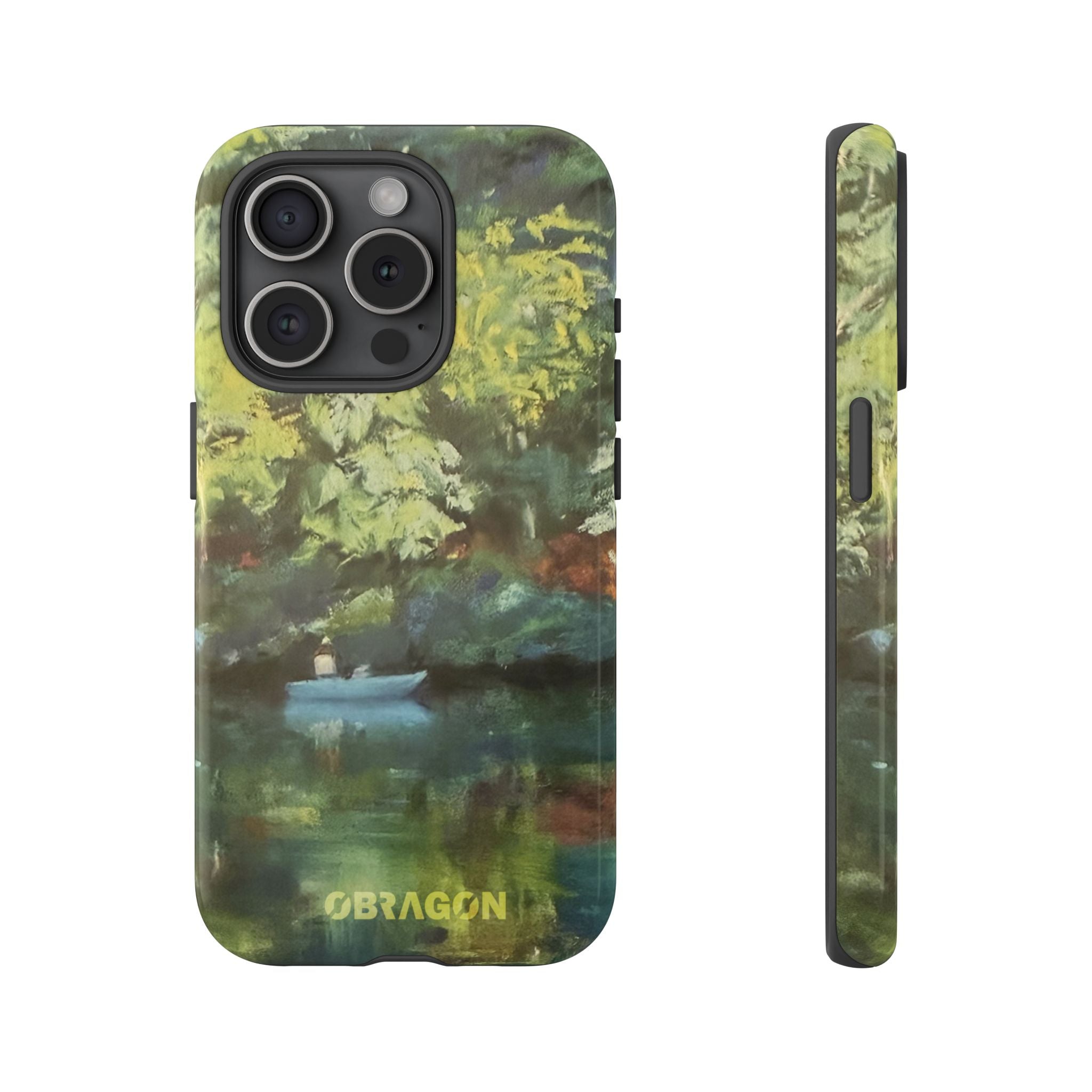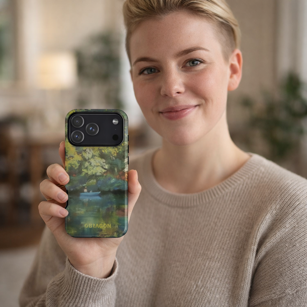 Serenity captures a quiet boat resting on a still pond, surrounded by lush green vegetation rendered in gentle watercolor detail. The scene feels calm and grounded, offering a moment of peaceful escape you can carry with you throughout the day. This design is part of the Nature's Palette collection, where each piece highlights the quiet beauty and restorative calm found in the natural world.