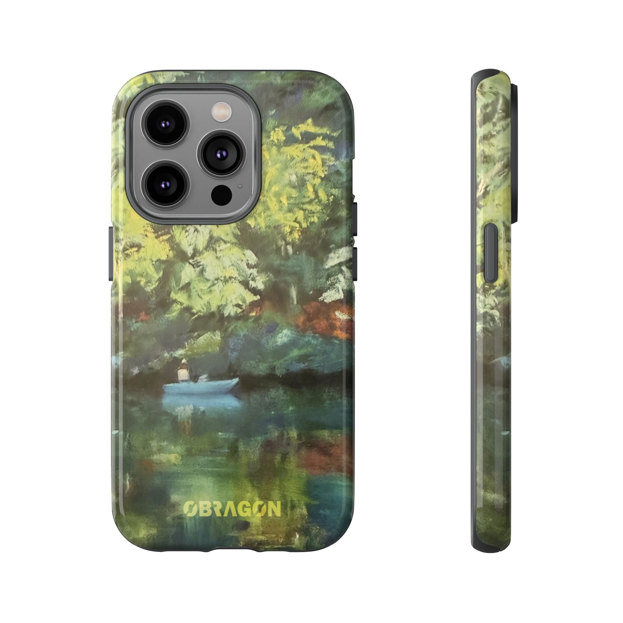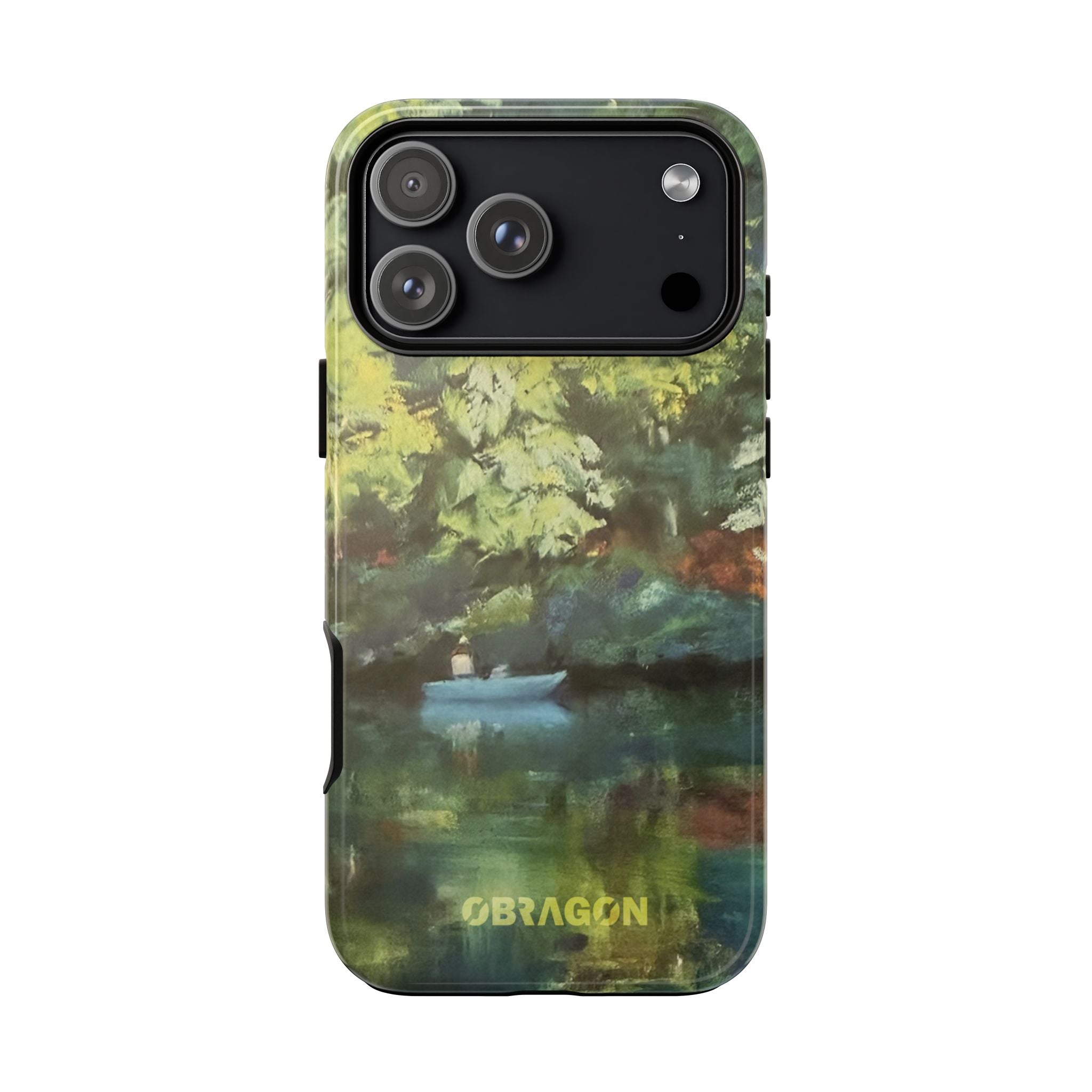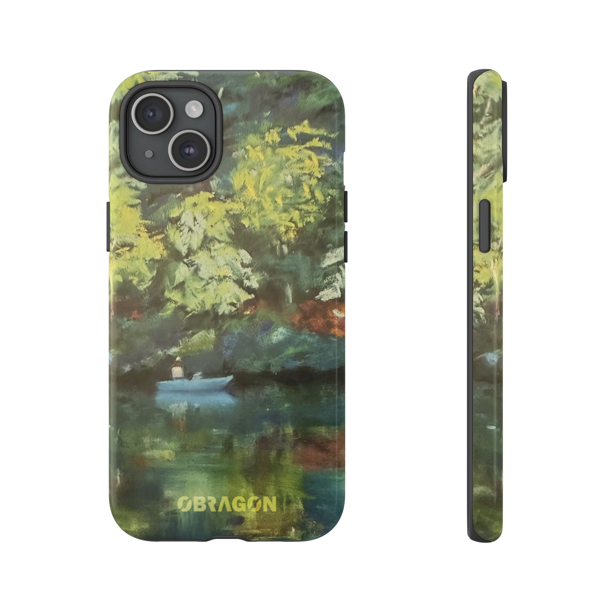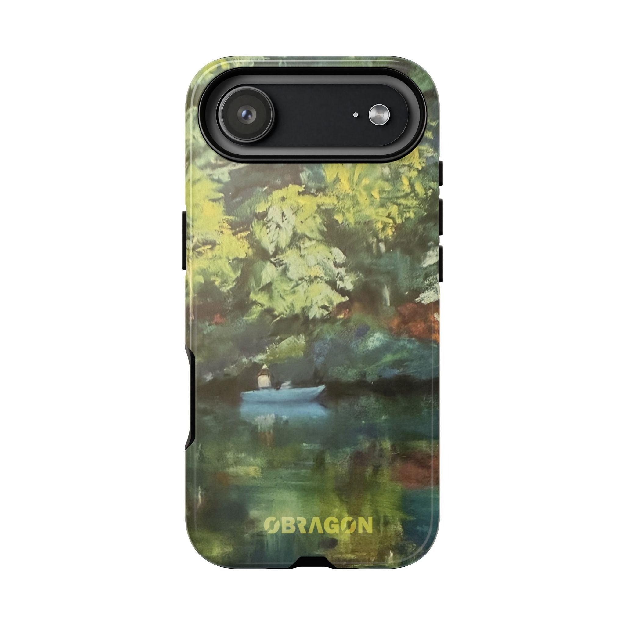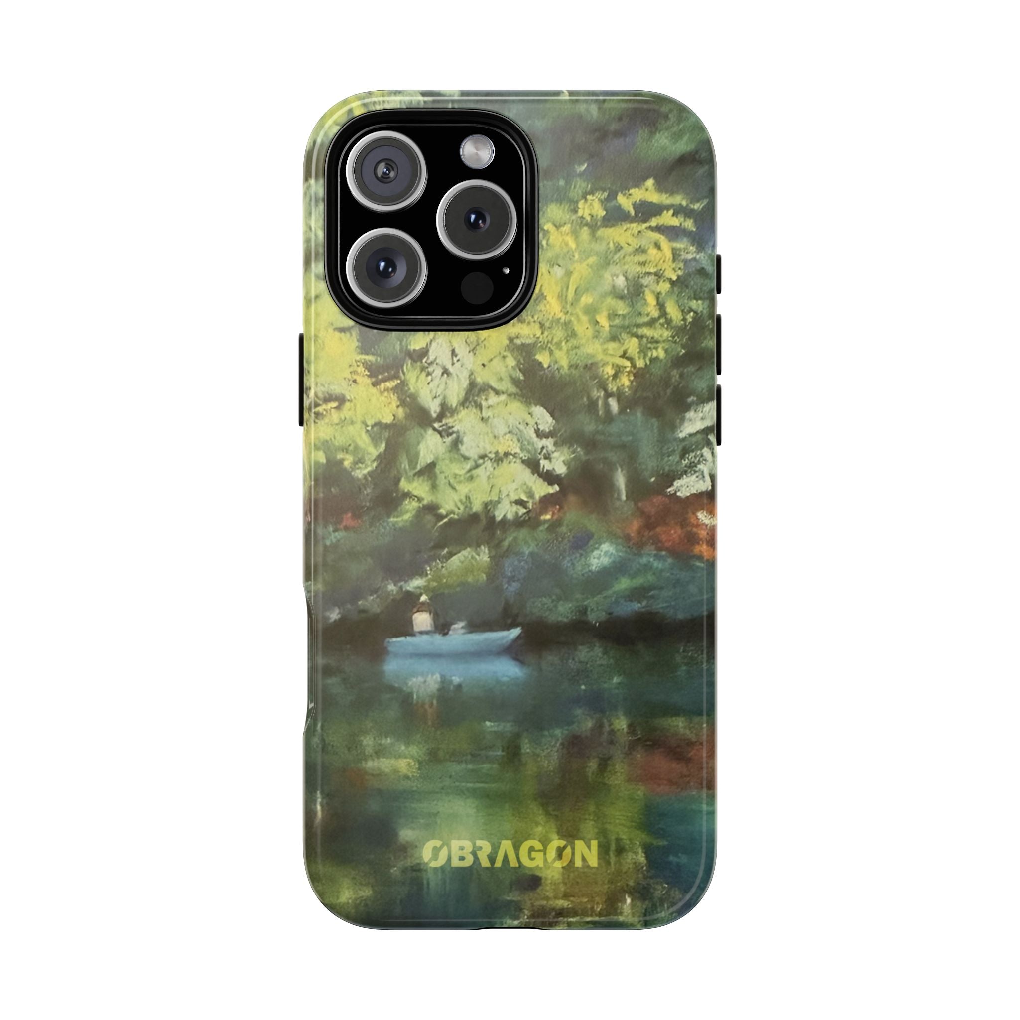 Serenity captures a quiet boat resting on a still pond, surrounded by lush green vegetation rendered in gentle watercolor detail. The scene feels calm and grounded, offering a moment of peaceful escape you can carry with you throughout the day. This design is part of the Nature's Palette collection, where each piece highlights the quiet beauty and restorative calm found in the natural world.